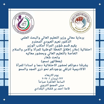 According to invitation of ministry of higher education and scientific research a Women’s Affairs head in the center of heritage revival /university of Baghdad assist prof. Dr. Rasha Essa Fares and a connectiong member Miss Enas Gareeb participated in Celebration announcing the launch of the National Plan for Women, Security and Peace, under the slogan (With their giving we rise)